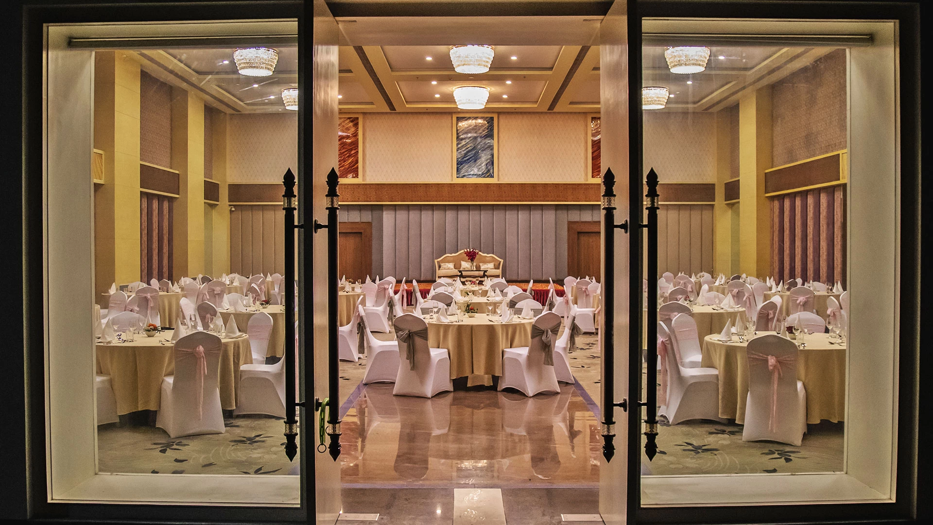 This grand hall with a ceiling height of over 15 feets is the venue of your dreams. It holds up to 1000 guests for a reception/cocktail and up to 750 guests for a banquet-style set up. The magnificent ballroom has an extensive courtyard with a grand fountain.